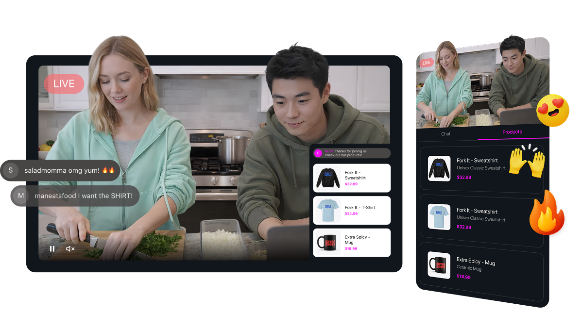 Host a live shopping experience and share it anywhere, so your audience can watch and buy in real time without being tied to a single platform.